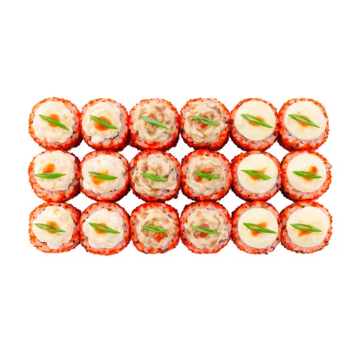 ОПАЛЕННЫЙ ЛОСОСЬ, СНЕЖНЫЙ КРАБ, СЛИВОЧНЫЙ СЫР, ОГУРЕЦ, ИКРА МАСАГО, ЛУК ЗЕЛЕНЫЙ, СОУТ ТРЮФЕЛЬНЫЙ АЙОЛИ (6 шт.)