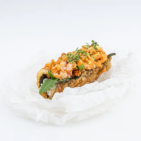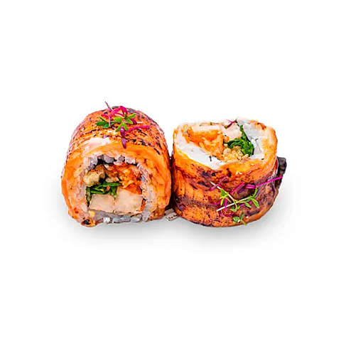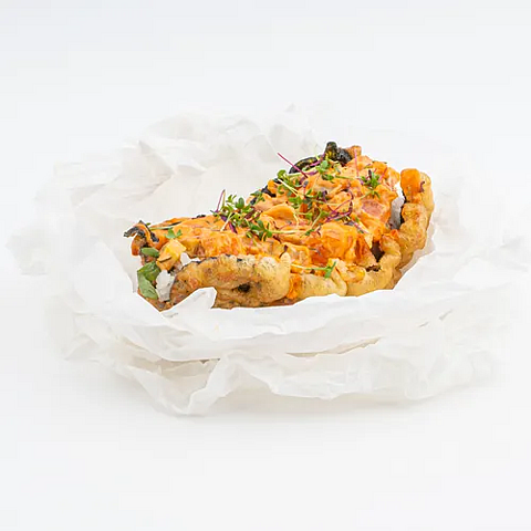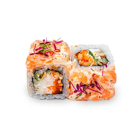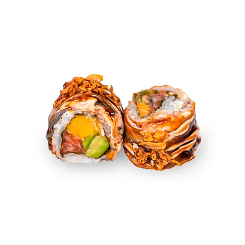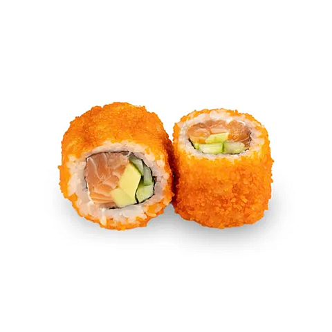 ОБЖАРЕННЫЙ ЛОСОСЬ, СЛИВОЧНЫЙ СЫР, СОУС СПАЙСИ, ТЕМПУРНАЯ КРОШКА, ИКРА МАСАГО, АВОКАДО, СОУС УНАГИ, КУНЖУТ (6 шт.)