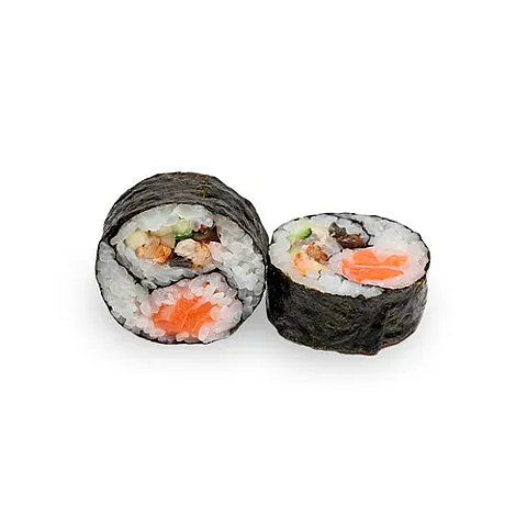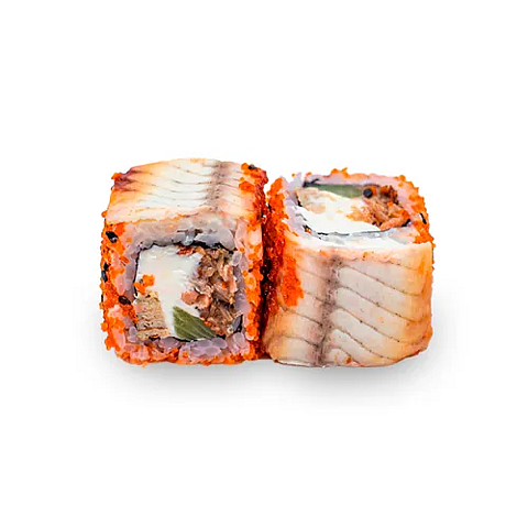 ЛОСОСЬ, УГОРЬ, СОУС СПАЙСИ, СОУС УНАГИ, РУККОЛА, ИКРА МАСАГО, ГРУША, ТЕМПУРНАЯ КРОШКА, СОУС МАЛИБУ, АМАРАНТ, КРЕСС-САЛАТ (6 шт.)