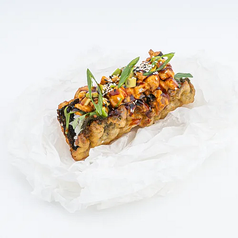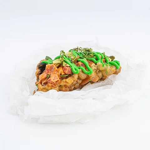 НЕЖНЕЙШИЙ ТАКО С ТУНЦОМ - ЭТО СОЧНЫЙ ТУНЕЦ С РИСОМ В ЛЕГКОМ КЛЯРЕ, ДОПОЛНЕННЫЙ АВОКАДО, ПИКАНТНЫМ СОУСОМ СПАЙСИ, СВЕЖЕЙ МИКРОЗЕЛЕНЬЮ И ФИРМЕННЫМ ВАСАБИ СОУСОМ