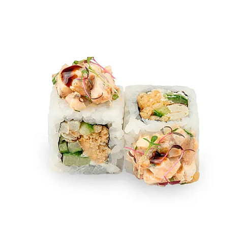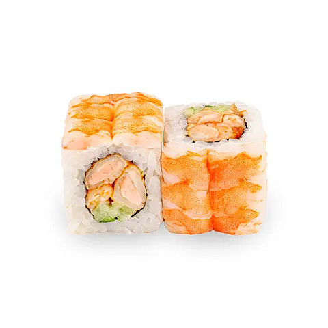 КРЕВЕТКА, ЛОСОСЬ В ТЕМПУРЕ, СЛИВОЧНЫЙ СЫР, ОГУРЕЦ, СОУС СПАЙСИ (6 шт.)