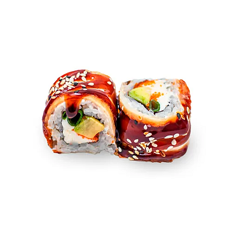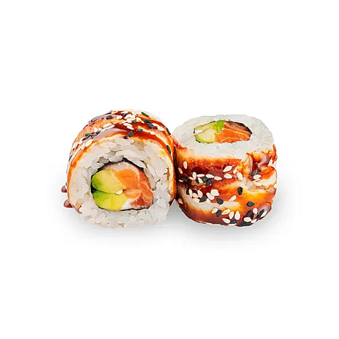 УГОРЬ, ЛОСОСЬ, АВОКАДО, МАЙОНЕЗ, СОУС УНАГИ, КУНЖУТ (6 шт.)