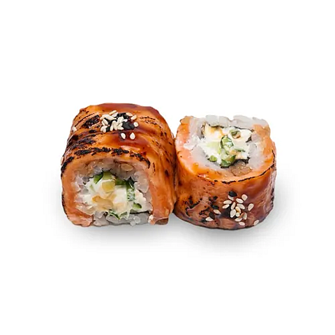ОПАЛЕННЫЙ ЛОСОСЬ, ОГУРЕЦ, СЛИВОЧНЫЙ СЫР, СОУС УНАГИ, КУНЖУТ (6 шт.)